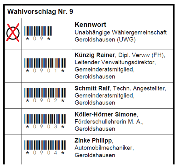 Die Kommunalwahl am 15. März 2020 in Geroldshausen und Moos So wählen Sie die Gemeinderäte der unabhängigen Wählergemeinschaft Geroldshausen am 15. März richtig: Liste wählen Kreuzen Sie einfach oben im großen Kästchen die Liste Nr. 9 - unabhängige Wählergemeinschaft Geroldshausen (UWG) an. Damit geben Sie jedem Kandidaten der UWG eine Stimme. Sie sollten auf jeden Fall die Liste ankreuzen, auch wenn Sie Ihre Stimmen an einzelnen Kandidaten verteilen. Damit geht keine Stimme verloren. Einzelne Kandidaten wählen Sie haben insgesamt 24 Stimmen zur Verfügung, die Sie frei unter den Kandidaten der UWG verteilen können. Geben Sie bitte 1, 2 oder 3 Stimmen und tragen Sie die jeweilige Zahl in das Kästchen vor dem Namen des Kandidaten ein. Achtung: Sie können maximal 24 Stimmen vergeben! Briefwahl Sollten Sie am 15. März nicht an der Wahl teilnehmen können, besteht für Sie die Möglichkeit der Briefwahl. Dazu wenden Sie sich bitte an Ihre Gemeinde und beantragen die Unterlagen zur Briefwahl. Denken Sie daran: Auf Ihre Stimme kommt es an! Schenken Sie uns Ihr Vertrauen!